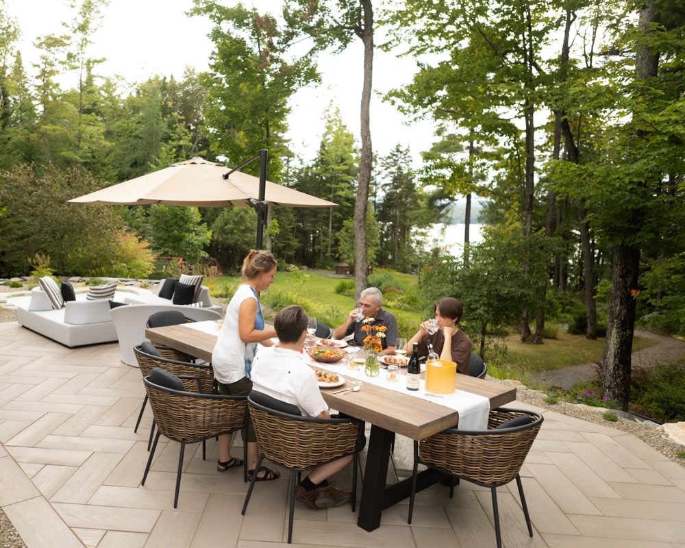 Le résultat final est un espace où l’on ressent immédiatement la zénitude. La terrasse agrandie et ses grandes marches, ouvrant sur le patio, créent une transition fluide entre la maison et l’extérieur. Le salon extérieur, avec sa grande table à manger proche de la cuisine, permet de profiter de moments chaleureux autour d’un repas, tout en offrant une vue imprenable sur le lac depuis le spa.